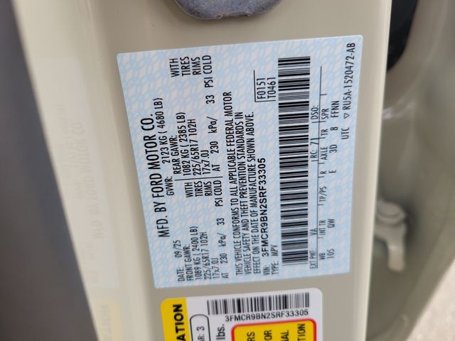 Convenience Package (Front Driver/Passenger Seat Back Map Pockets, Heated 8-Way Power Driver's Seat, LED Fog Lamps, Premium Wrapped Steering Wheel, and Universal Garage Door Opener (UGDO)), Equipment Group 200A, 4-Wheel Disc Brakes, 6 Speakers, ABS brakes, Air Conditioning, Alloy wheels, AM/FM radio: SiriusXM, AM/FM Stereo, Auto High-beam Headlights, Automatic temperature control, Brake assist, Cloth w/Easy-to-Clean Front Bucket Seats, Compass, Delay-off headlights, Driver door bin, Driver vanity mirror, Dual front impact airbags, Dual front side impact airbags, Electronic Stability Control, Emergency communication system: SYNC 4 911 Assist, Four wheel independent suspension, Front anti-roll bar, Front Bucket Seats, Front Center Armrest, Front License Plate Bracket, Front reading lights, Fully automatic headlights, Heated door mirrors, Illuminated entry, Knee airbag, Low tire pressure warning, Occupant sensing airbag, Outside temperature display, Overhead airbag, Overhead console, Panic alarm, Passenger door bin, Passenger vanity mirror, Power door mirrors, Power steering, Power windows, Radio data system, Rear anti-roll bar, Rear Parking Sensors, Rear reading lights, Rear seat center armrest, Rear window defroster, Rear window wiper, Remote keyless entry, Security system, SiriusXM, Speed control, Speed-sensing steering, Speed-Sensitive Wipers, Split folding rear seat, Steering wheel mounted audio controls, SYNC 4 w/Enhanced Voice Recognition, Tachometer, Telescoping steering wheel, Tilt steering wheel, Traction control, Trip computer, Variably intermittent wipers, and Wheels: 17" Carbonized Gray-Painted Aluminum. *Some rebates have qualifications. ##Ford Credit Retail Bonus Cash Rebate requires Ford Credit financing, not all buyers will qualify. ##Select Inventory Retail Customer Cash Rebate, vehicle must have arrived 61 days or more prior to sale, limited supply. ##Open or Special Trade Assistance Cash Rebate requires Trade in vehicle that is 1995 or newer. ##Price includes: $1000 - 2025 First Responder Recognition Exclusive Cash Reward. Exp. 01/05/2026 $1000 - Final Days Mega Bonus Cash. Exp. 01/02/2026 $1000 - Toyota Competitive Conquest Bonus Cash. Exp. 01/05/2026 $1500 - Retail Bonus Cash. Exp. 01/05/2026 $500 - Bonus Customer Cash. Exp. 01/05/2026