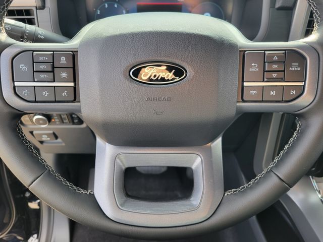 Bed Utility Package (4 Pickup Box Tie-Down Plates, LED Box Lighting, and Tailgate Step w/Tailgate Work Surface), Equipment Group 302A Mid, FX4 Off-Road Package, 4WD, 4-Wheel Disc Brakes, 6 Speakers, ABS brakes, Air Conditioning, Alloy wheels, AM/FM radio: SiriusXM with 360L, Auto High-beam Headlights, Brake assist, Bumpers: chrome, Chrome wheels, Cloth 40/20/40 Front Seat, Compass, Delay-off headlights, Driver door bin, Driver vanity mirror, Dual front impact airbags, Dual front side impact airbags, Electronic Stability Control, Emergency communication system: SYNC 4 911 Assist, Front anti-roll bar, Front Center Armrest, Front fog lights, Front License Plate Bracket, Front reading lights, Front wheel independent suspension, Fully automatic headlights, Heated door mirrors, Illuminated entry, Internet access capable: FordPass Connect 5G, Low tire pressure warning, Occupant sensing airbag, Outside temperature display, Overhead airbag, Overhead console, Panic alarm, Passenger door bin, Passenger vanity mirror, Power door mirrors, Power steering, Power windows, Radio data system, Radio: AM/FM Stereo w/SiriusXM 360L, Rear Parking Sensors, Rear reading lights, Rear step bumper, Rear window defroster, Remote keyless entry, Security system, Speed control, Split folding rear seat, Steering wheel mounted audio controls, SYNC 4 w/Enhanced Voice Recognition, Tachometer, Telescoping steering wheel, Tilt steering wheel, Traction control, Trip computer, Variably intermittent wipers, Voltmeter, and Wheels: 18" Chrome-Like PVD.