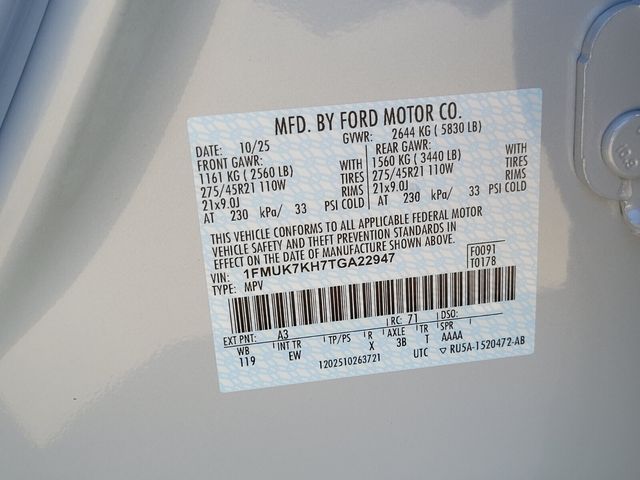 10 Speakers, 3rd row seats: bench, 4-Wheel Disc Brakes, ABS brakes, Air Conditioning, Alloy wheels, AM/FM radio: SiriusXM with 360L, Apple CarPlay/Android Auto, Auto High-beam Headlights, Automatic temperature control, Brake assist, Bumpers: body-color, Compass, Delay-off headlights, Driver door bin, Driver vanity mirror, Dual front impact airbags, Dual front side impact airbags, Electronic Stability Control, Emergency communication system: 911 Assist, Exterior Parking Camera Rear, Four wheel independent suspension, Front anti-roll bar, Front Bucket Seats, Front Center Armrest, Front dual zone A/C, Front fog lights, Front reading lights, Fully automatic headlights, Garage door transmitter, Heated door mirrors, Heated front seats, Heated steering wheel, Heated Unique Cloth Captain's Chairs, Illuminated entry, Knee airbag, Leather steering wheel, Low tire pressure warning, Navigation System, Occupant sensing airbag, Outside temperature display, Overhead airbag, Overhead console, Panic alarm, Passenger door bin, Passenger vanity mirror, Power door mirrors, Power driver seat, Power Liftgate, Power passenger seat, Power steering, Power windows, Radio: B&O Sound System by Bang and Olufsen, Rear air conditioning, Rear anti-roll bar, Rear reading lights, Rear window defroster, Rear window wiper, Remote keyless entry, Security system, Speed control, Speed-sensing steering, Speed-Sensitive Wipers, Split folding rear seat, Spoiler, Steering wheel mounted audio controls, Tachometer, Telescoping steering wheel, Tilt steering wheel, Traction control, Trip computer, Variably intermittent wipers, and Wheels: 20" Ebony-Painted Machined Aluminum. *Some rebates have qualifications. ##Ford Credit Retail Bonus Cash Rebate requires Ford Credit financing, not all buyers will qualify. ##Select Inventory Retail Customer Cash Rebate, vehicle must have arrived 61 days or more prior to sale, limited supply. ##Open or Special Trade Assistance Cash Rebate requires Trade in vehicle that is 1995 or newer. ##Price includes: $500 - Bonus Customer Cash. Exp. 01/05/2026